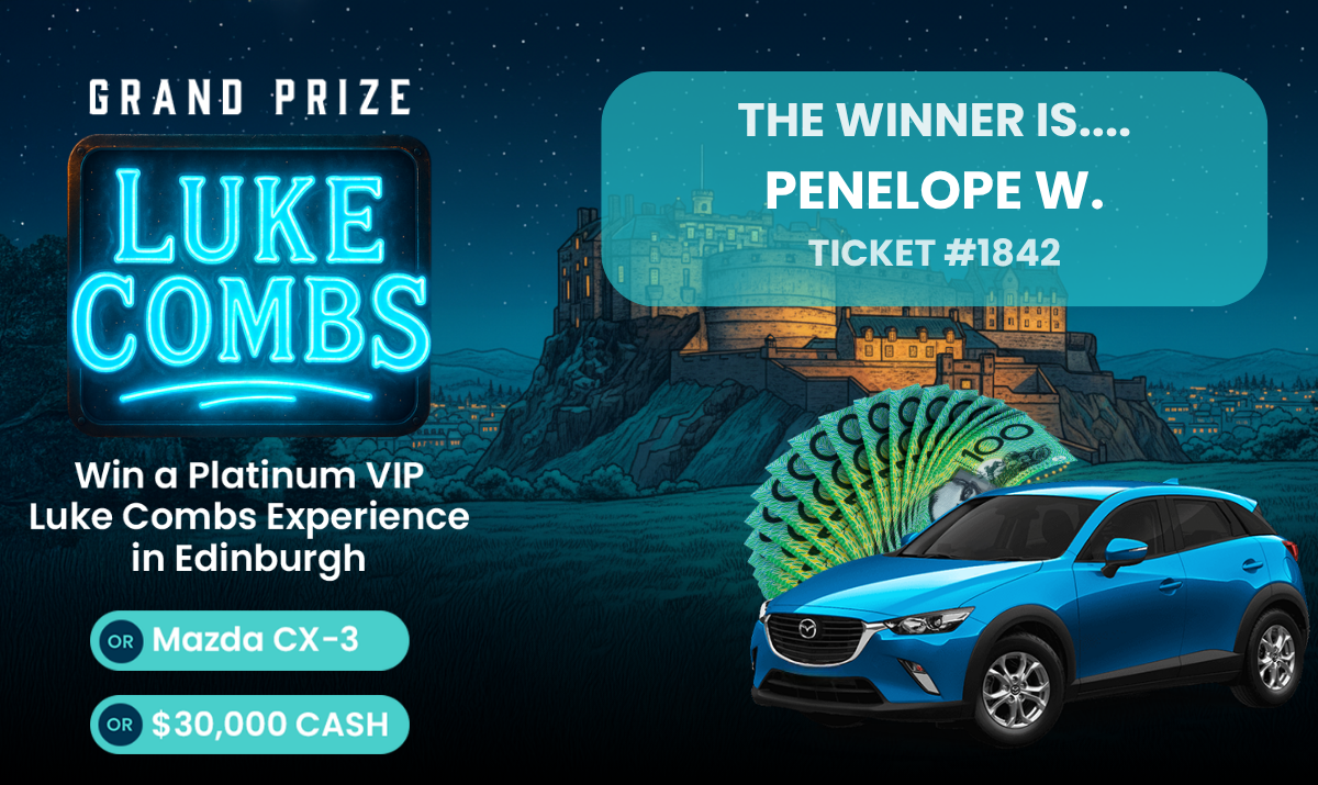 Penelope W (Ticket #1842) has the choice between 2 x Platinum VIP tickets to see Luke Combs live in concert in Edinburgh Or, a Mazda CX-3 Or $30,000 in Cash.
