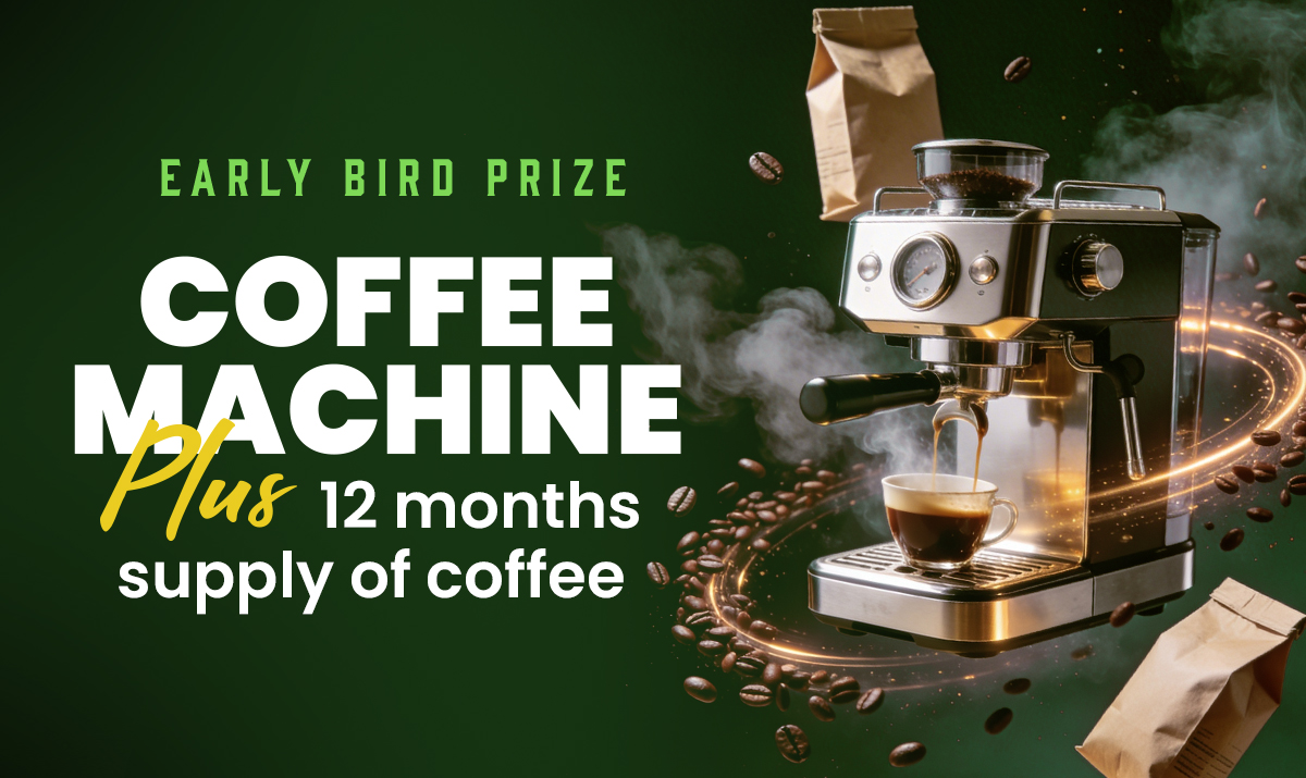 The Early Bird Winner will receive a Coffee Machine plus a 12-month supply of coffee.